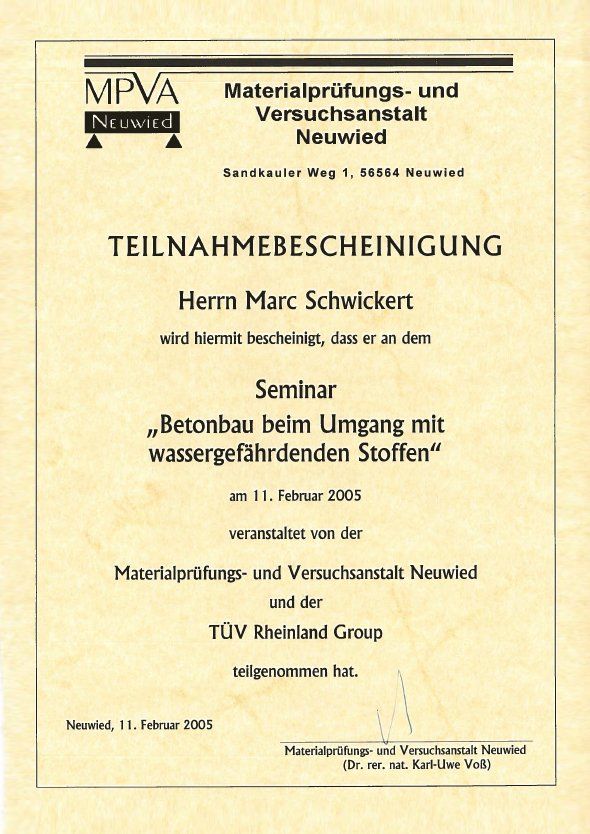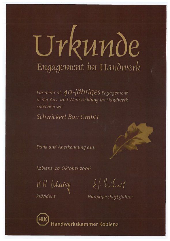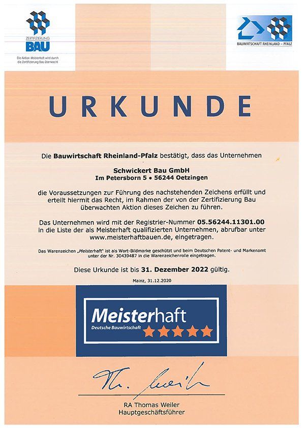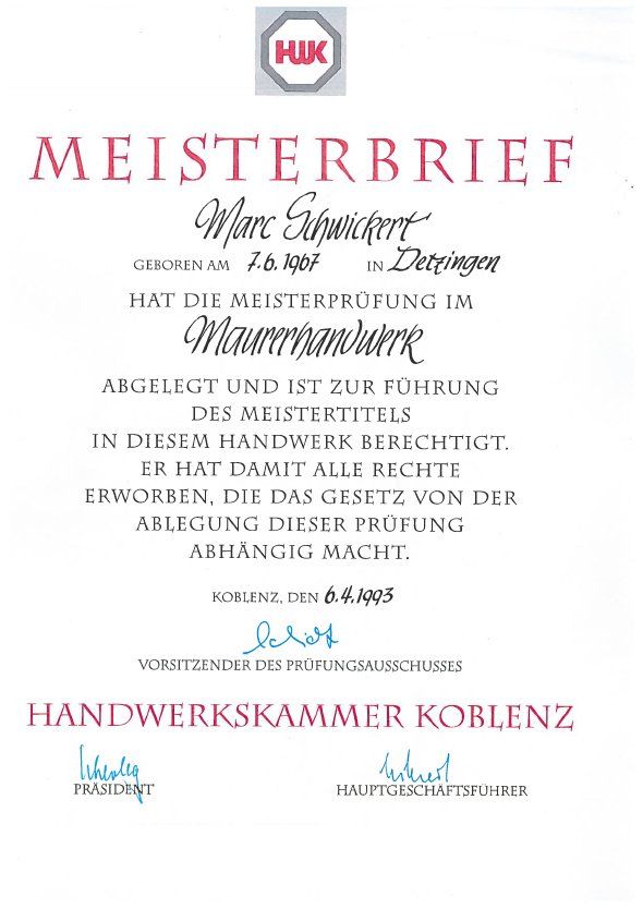 Hohe Ansprüche an die Qualität und Professionalität der eigenen Arbeiten sind in der Familientradition von Schwickert Bau fest verankert. Marc Schwickert arbeitete lange Zeit Seite an Seite mit seinem Vater Benno Schwickert. Dieser vermittelte ihm das traditionell hohe Qualitäts- und Verantwortungsbewusstsein - wichtige Bausteine im Hochbau, Tiefbau und Stahlbetonbau. Dank kontinuierlicher Weiterbildungen und Zusatzqualifikationen sind wir immer auf dem neusten Stand der Technik.