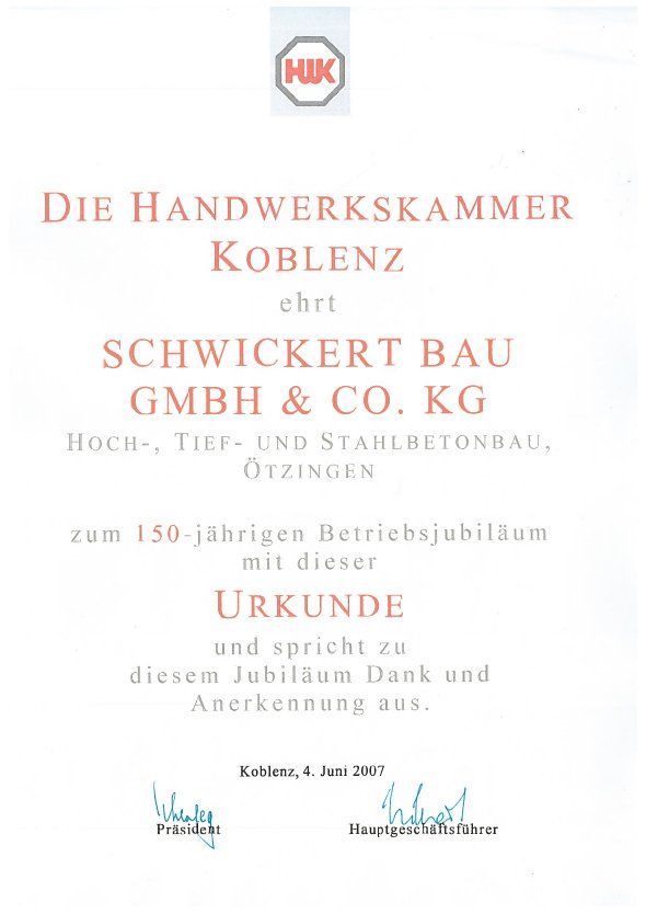 Traditionelle Werte und moderne Bauweisen sind unser Erfolgsmodell. Unser Familienunternehmen Schwickert Bau wurde 1857 gegründet und besteht nunmehr seit über 150 Jahren. Wir sind stolz darauf, dass schon in fünfter Generation Kompetenz und Know-how in den Bereichen Hochbau, Tiefbau und Stahlbetonbau vom Vater an den Sohn weiter gegeben wurden. Arbeitete der Ur-Ur-Großvater Jakob Schwickert noch mit Spaten und Handkarren, so hat Marc Schwickert, Geschäftsführer und stellvertretender Innungsobermeister, heutzutage ca. 30 Mitarbeiter und technisch stets aktuelle Baumaschinen im Einsatz.